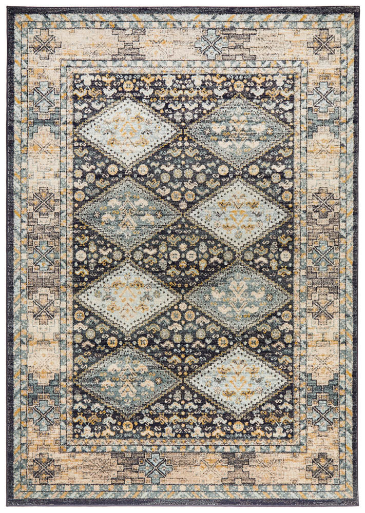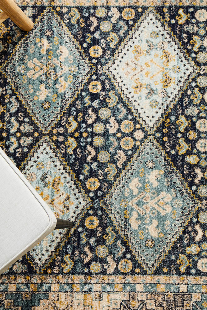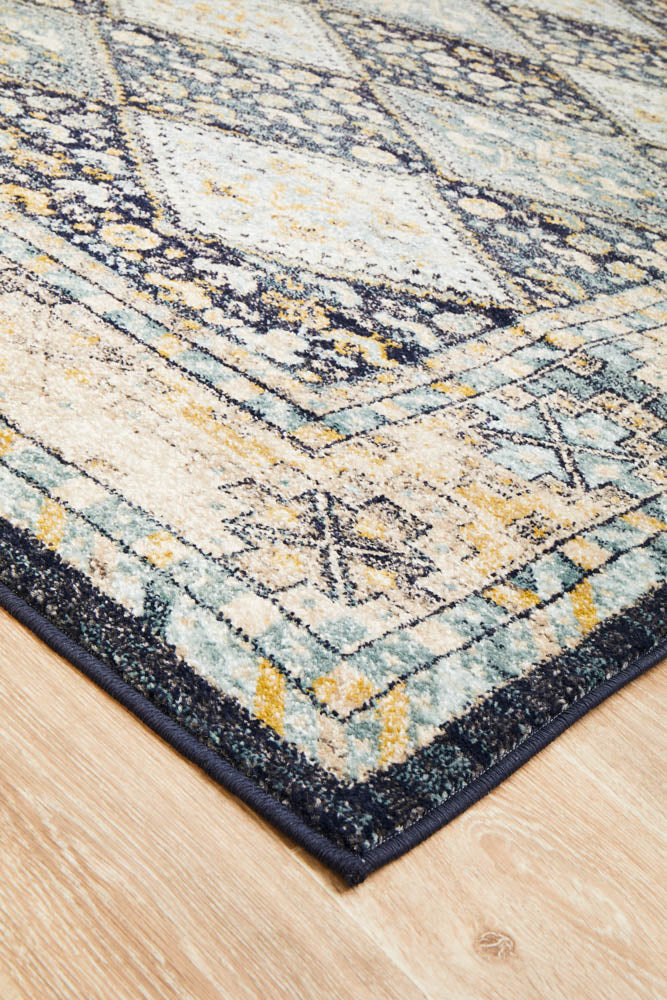 Bring out the beauty and elegance with a touch of global inspiration with this head turning, eye catching pile. The Legacy Navy Rug made from quality polypropylene materials is machine woven in Turkey. It showcases an intertwining diamond scheme laid in a dark hue context, with duly imposed serge edges of interloping black and navy yarns adding more value and durability to the product. Definitely high chic and can withstand well-traveled areas.
