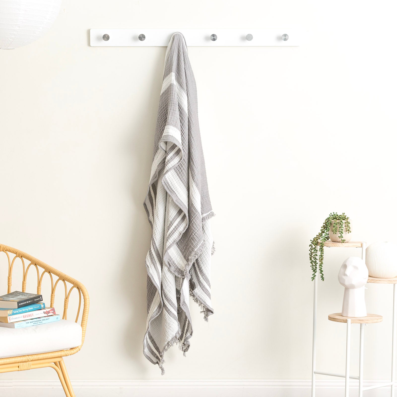 Ray Striped vintage washed throw has a delicate construction of a cotton muslin material that is airy and comfortable. The contemporary horizontal stripe patterned gives an instant stylish modern look to your favourite space. This throw has a fringe with a ragged edge on 2 sides. Each colour option has an ecru or white reverse that complements the modern contemporary look. It is breezy, simple to care for, and the ideal throw blanket for spring and summer. Proudly made in Green. All our packaging is biodegradable & environment friendly.