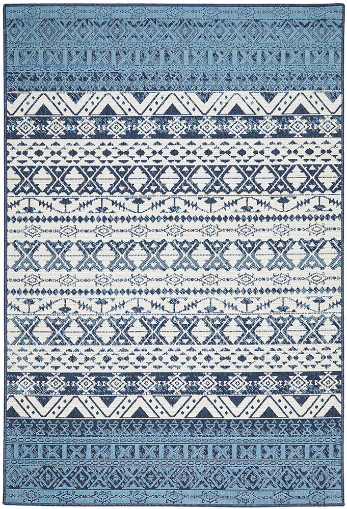This tribal inspired motif in gorgeous blues bring a bit of boho to every space. This easy-care collection is designed to be used outdoors as well as indoors, these rugs are water resistant and will add an element of fun to any space. This short, easy to clean pile made from durable polypropylene and is power loomed.