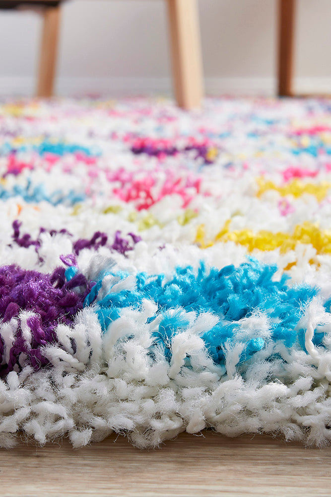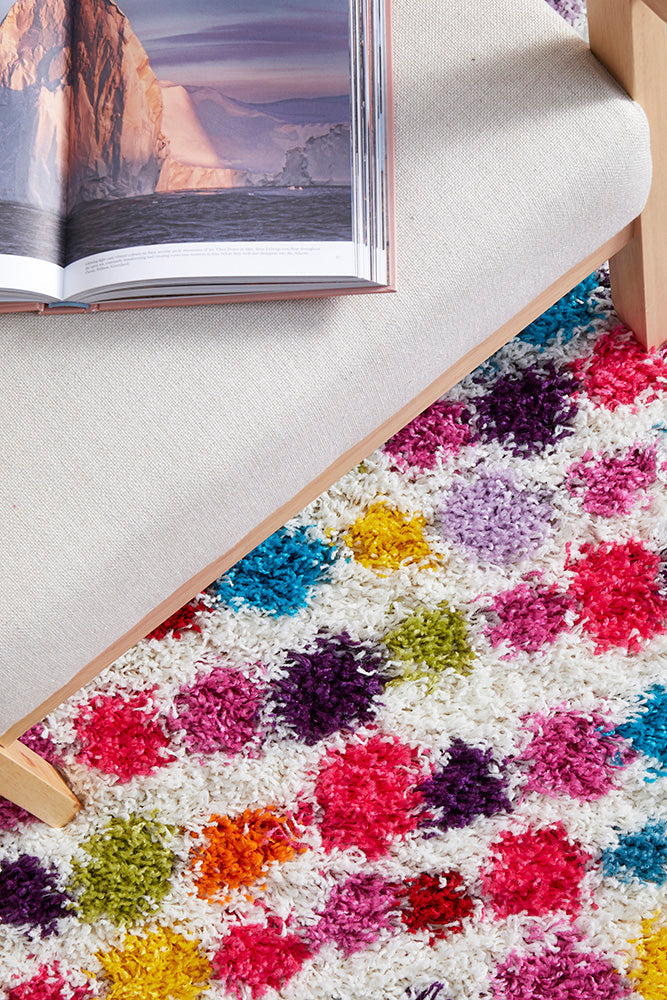 Bursting with personality, Vegas is sure to brighten up your floors with its vibrant playful design. This fabulous low-pile shag style rug showcases a stunning display of multi-coloured dots that make it a great choice for electric interiors and kids playrooms.